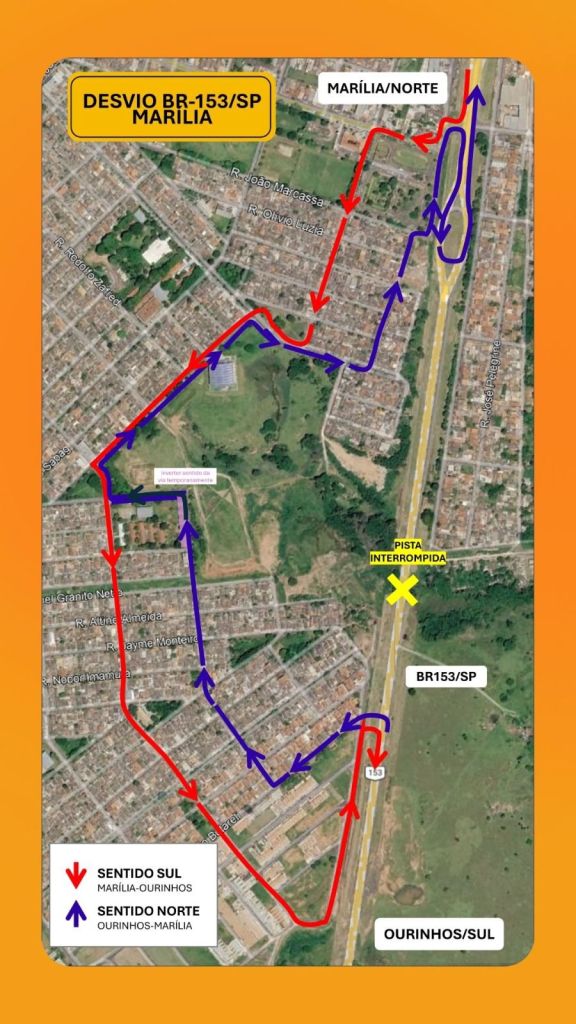 – Sentido Marília → Ourinhos (Sul): desvio no km 257 (trecho urbano de Marília). O tráfego é direcionado para a SP-294 e, na sequência, para a SP-331, retornando à BR-153 após o trecho bloqueado.