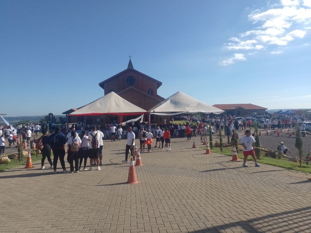 Após a caminhada, os participantes acompanharam a missa das 10h no Mosteiro, que reuniu grande público. O espaço foi preparado com tendas, cadeiras externas e sistema de som, proporcionando conforto e segurança aos fiéis.