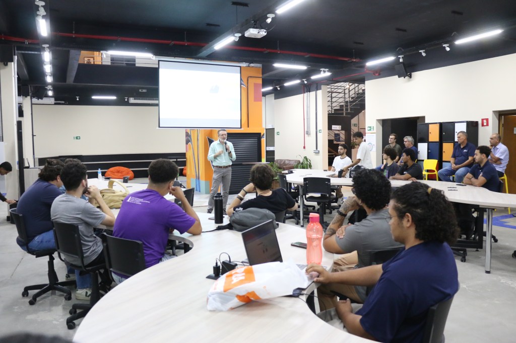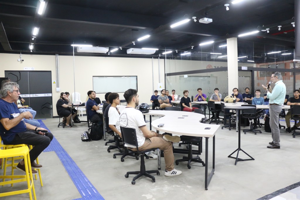 palestra exclusiva com o CEO Marco Antonio Vasquez. Com foco no ecossistema de inovação, o evento discutiu como transformar ideias acadêmicas em negócios de alto impacto, preparando os futuros profissionais para os desafios da era digital.