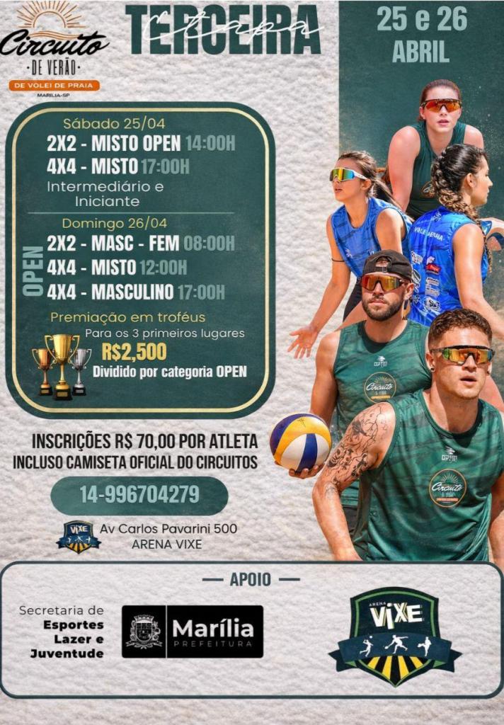 Com apoio da Prefeitura de Marília, por meio da Secretaria Municipal de Esportes, Lazer e Juventude, acontece neste final de semana, dias 25 e 26 de abril, a terceira etapa do Circuito de Verão de Vôlei de Praia.