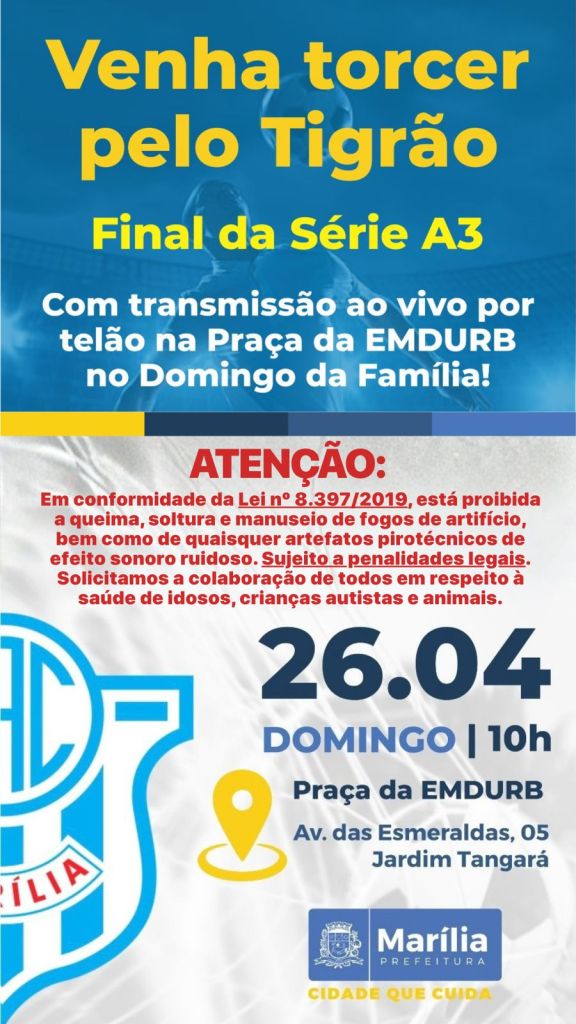 A Prefeitura de Marília informou, por meio de nota oficial, que a Avenida das Esmeraldas será palco de três importantes eventos neste domingo. A programação inclui o Cãopanheiro, a Caminhada do Autismo e Neurodivergentes e a transmissão do jogo do MAC, reunindo diferentes públicos ao longo do dia.