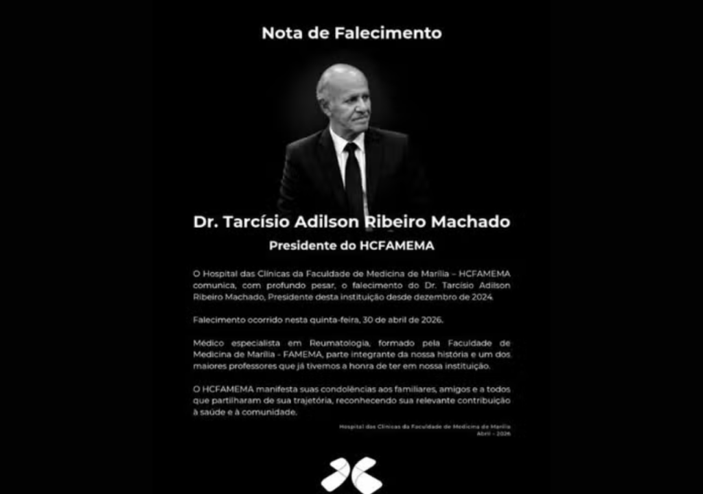 A comunidade médica e acadêmica de Marília amanheceu em luto nesta quinta-feira (30) com a notícia da morte do presidente do Hospital das Clínicas da Faculdade de Medicina de Marília (HCFamema), Dr. Tarcísio Adilson Ribeiro Machado, aos 72 anos.